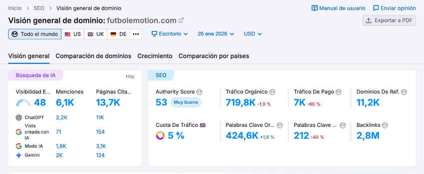 Merece la pena hablar de la nueva realidad de las búsquedas en Internet, y cómo Fútbol Emotion ha encajado con el impacto de la IA en el SEO. De hecho, vemos cómo las propias herramientas han ido evolucionando para mostrarnos información de cómo, cuándo y dónde aparece nuestra marca.