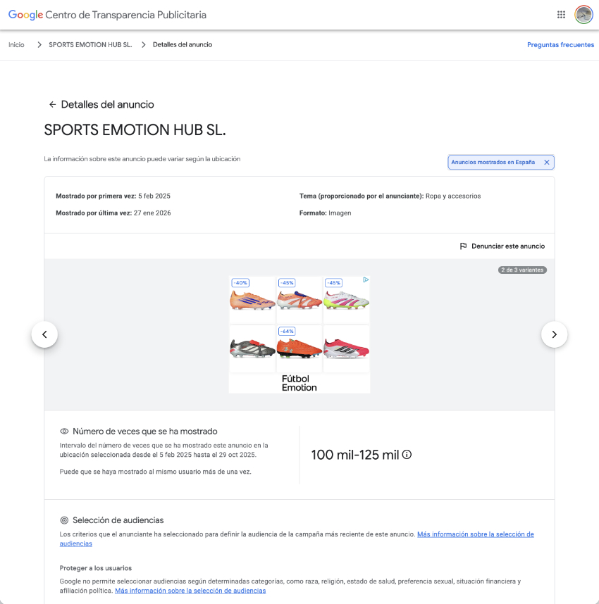 Para ver cómo son sus anuncios, como siempre, recurriremos a las fuentes oficiales. Por si no lo sabes, Google tiene su centro de transparencia, en el que puedes inspeccionar los anuncios publicados por cualquier marca en Google Search, Display y Shopping.