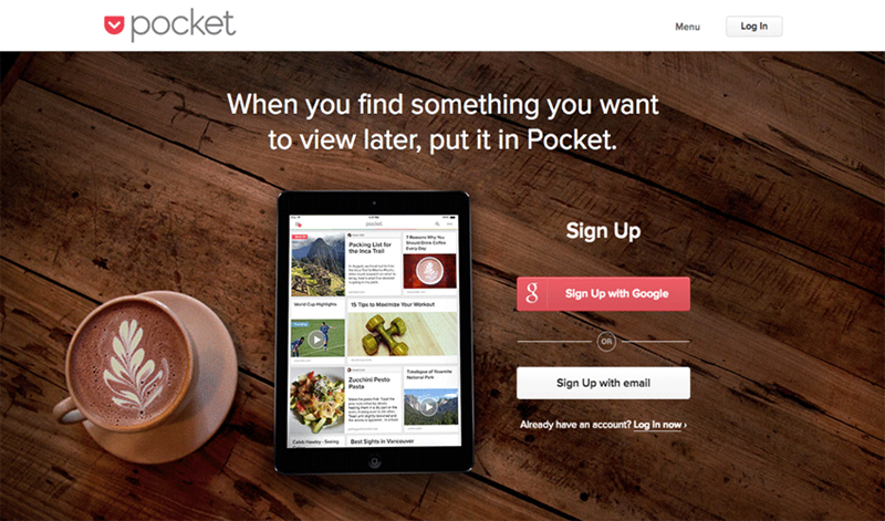 Pocket es realmente fácil de usar. Es una herramienta gratuita (aunque tiene versión Premium), con lo que sólo tienes que registrarte y empezar a usarla. Puedes registrarte con tu correo o directamente con tu cuenta de Google.