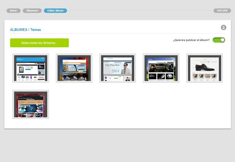 Para crear un álbum tienes que ir a "OPCIONES" en la parte superior del menú, y dentro de "Contenidos" encontrarás el apartado llamado "Ficheros y Multimedia". Selecciona la pestaña "Álbumes" y listo. -