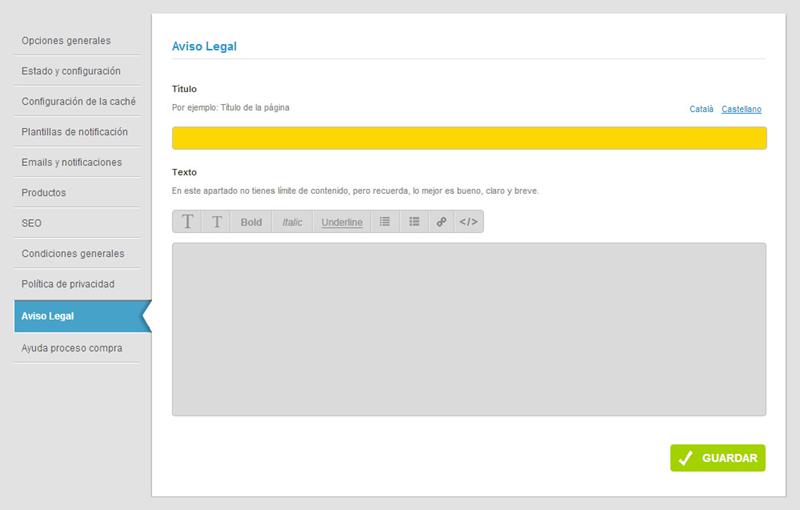 En esta sección introduciremos el aviso legal de nuestro sitio web. Si tienes varios idiomas se mostrarán en la parte superior derecha.