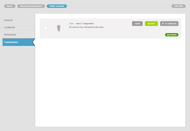 Cuando recibas comentarios en las entradas de tu blog/s podrás gestionarlo/s a través de esta página. Como puedes ver en la imagen, es muy sencillo administrarlos.