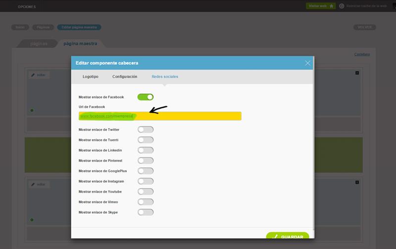 2) Esta pantalla muestra la página maestra sobre la que ya hablamos al detalle en otra ayuda. Entra en la sección llamada cabecera, que es donde se encuentran los iconos de las redes sociales. A continuación haz clic en EDITAR: