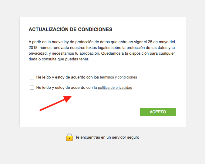 En el caso de que un usuario ya registrado, al iniciar sesión, se le mostrará el siguiente mensaje de actualización de condiciones. En dicho mensaje se le informa que con motivo de la entrada en vigor de la nueva ley de protección de datos, ha de aceptar las nuevas condiciones y dar su consentimiento: