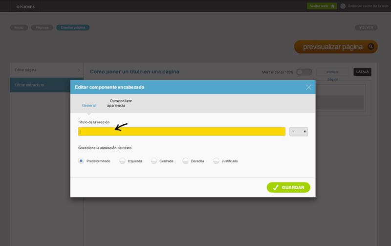 5) Por último, observa que se ha abierto una nueva ventana. En ella escribirás el título que quieras que aparezca en la página. Además se ofrece la opción de alinear el título de la página en el apartado Selecciona la alineación del texto: