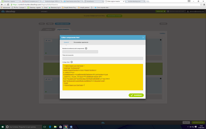 5) En la pestaña GENERAL del componente tienes que pegar el código html que zopim te envió por email. Una vez lo hayas pegado haz clic en el botón GUARDAR que aparece a pie de página: