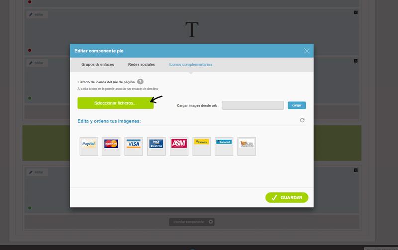 4) Como puedes observar en la siguiente imagen hemos imaginado que ya tenías los logos en el disco duro de tu ordenador preparados para subirlos a tu tienda online. Para ello el último paso sería simplemente hacer clic en el botón SELECCIONAR FICHEROS y subir los iconos que deseas mostrar: