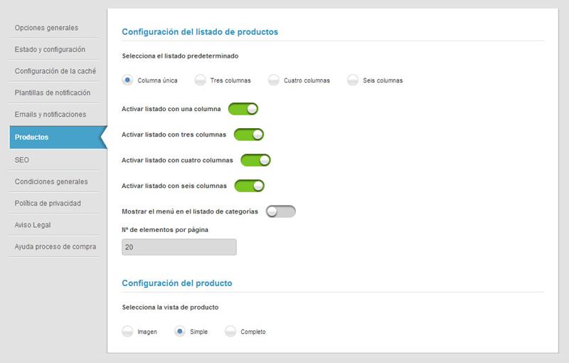 También puedes activar o desactivar los listados que quieras. Podrás también escoger el número de productos por página.
