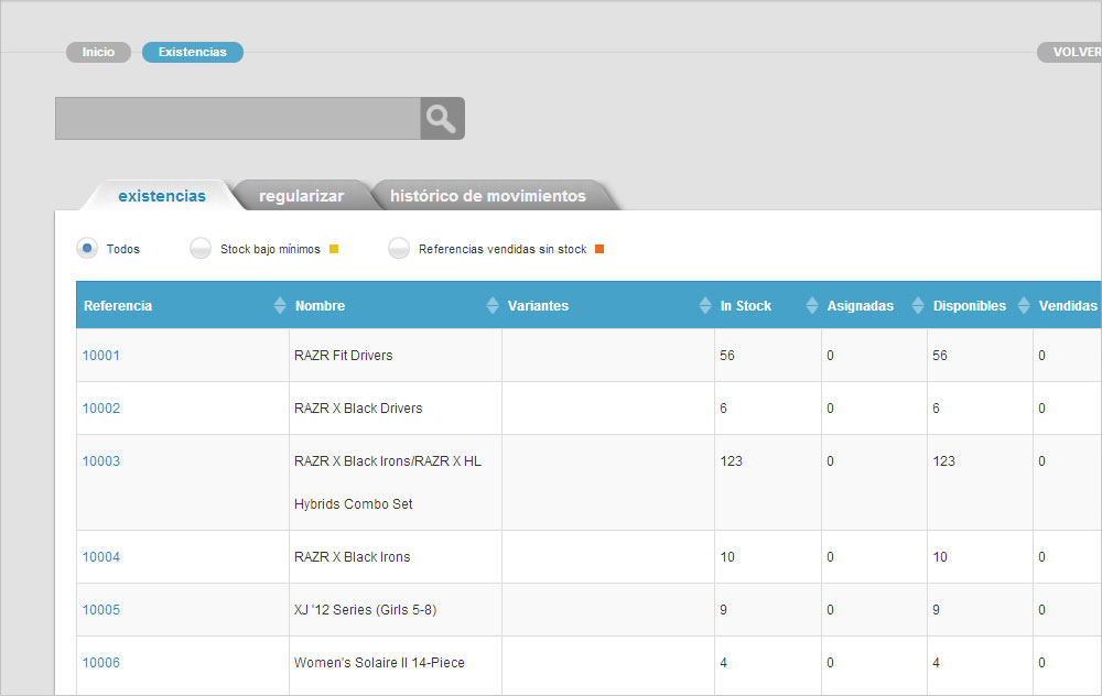 Los listados de datos los verás en los módulos de la plataforma que lo necesiten, por ejemplo, en el módulo de gestión de existencias. Los listados de datos te permiten ordenar los datos, dimensionar el ancho de las columnas, configurar el número de filas visibles y paginar fácil y rápidamente.