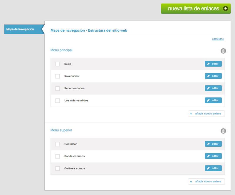 Lo primero que te encontrarás son dos listas de enlaces que se crean automáticamente al crear la tienda. La primera lista corresponde al menú principal y la segunda lista al menú superior derecho. Puedes crear, editar y eliminar los enlaces muy fácilmente.