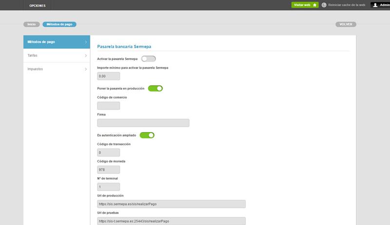 1) El primer paso para activar la opción de transferencia bancaria comienza accediendo a OPCIONES , después entra en la sección CONFIGURACIÓN y por último en PAGOS E IMPUESTOS tal y como se ve en la imagen inferior: -