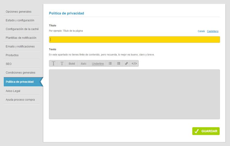En esta sección introduciremos la política de privacidad de nuestro sitio web. Si tienes varios idiomas se mostrarán en la parte superior derecha.