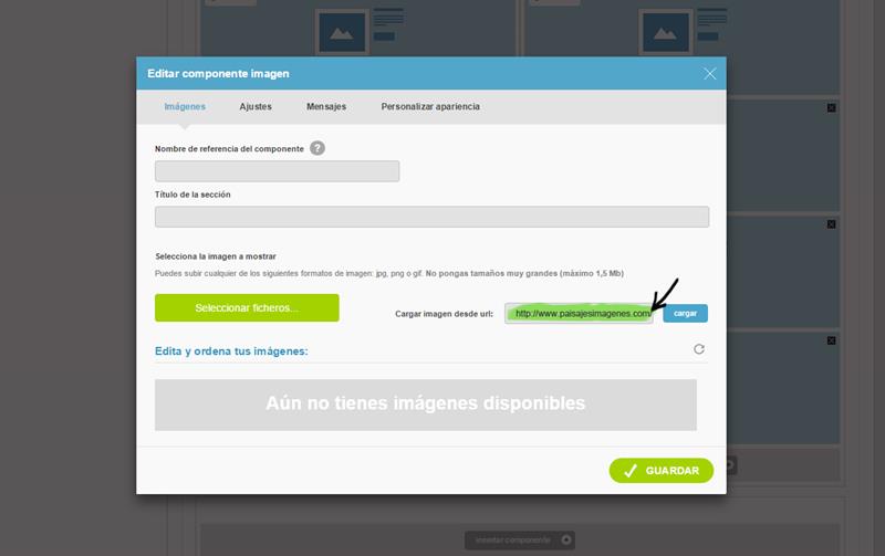 1) Poner una imagen es muy fácil. Cuando estés en la ventana de subir fotos de cualquier componente, siempre aparece la opción SELECCIONAR FICHEROS. Es ahí donde subes las fotos desde tu disco duro. Pues bien, al lado de este botón puedes ver un campo de texto llamado CARGAR IMAGEN DESDE URL. Desde aquí es donde añadirás la ruta de la imagen que quieras subir desde internet: -