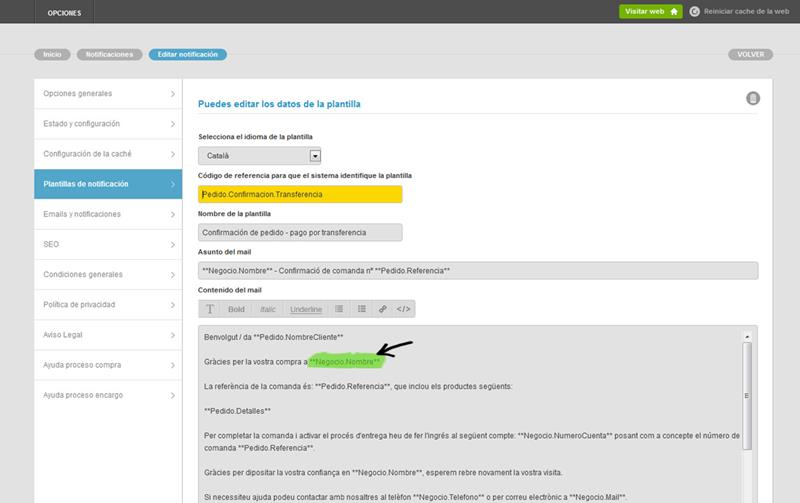 3) Una vez aquí vas a editar la plantilla que deseas modificar. Para hacerlo, debes ir con mucho cuidado respetando las variables que van entre asteriscos: