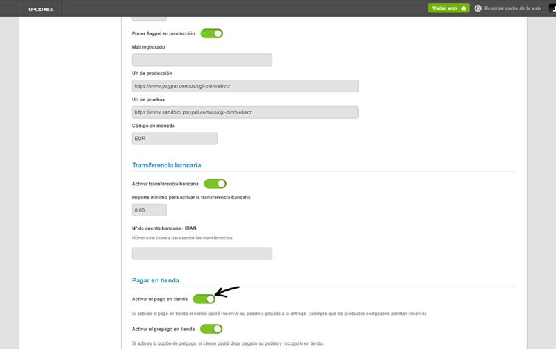 3) Por último, una vez que llegues a la sección PAGO EN TIENDA, tan sólo tendrás que activar la opción ACTIVAR EL PAGO EN TIENDA como puedes observar en la imagen de más abajo: