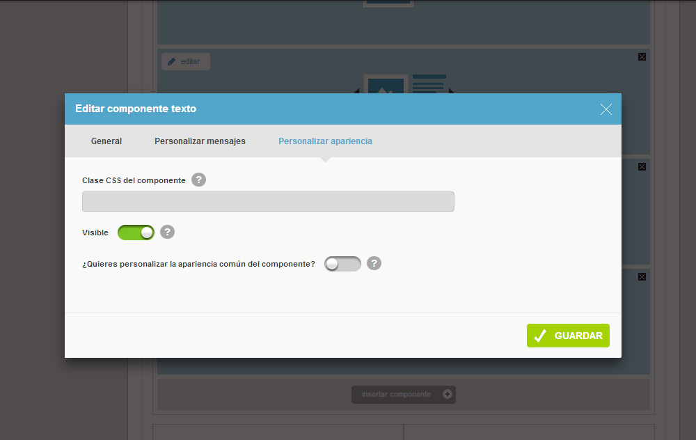 Esta sección es común en todos los componentes, aquí podrás activar o desactivar la visibilidad del componente.