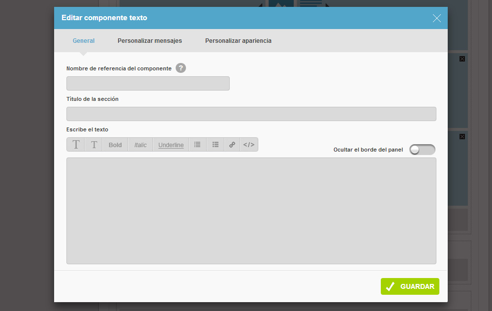 Este componente está dividido en 3 secciones principales, vamos a enumerarlas y explicar todas sus opciones.