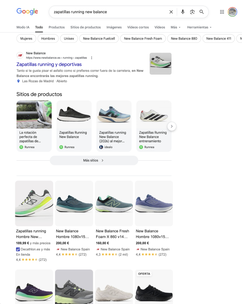 - Carruseles de compras (shopping): las fichas de producto de distintas tiendas, que permiten al usuario comparar precios, saber valoraciones y disponibilidad de stock, sin necesidad de hacer clic ni visitar cada tienda. Esto ayuda mucho cuando se está valorando entre varias opciones.