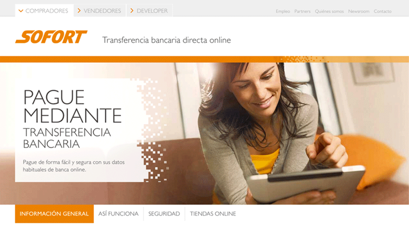Sofort ofrece al usuario una plataforma segura en la que realizar el pago por transferencia sin necesidad de completar registros ni darse de alta en ningún servicio adicional. El pago por transferencia es directo, sin esperas, y el sistema genera y envía automáticamente una confirmación de transferencia al comercio, de tal modo que el pedido se puede tramitar inmediatamente y ni comercio ni cliente tienen que esperar.