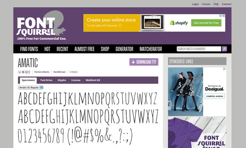 Font Squirrel és un web de descàrrega de tipografies gratis per a ús comercial, en la qual hi trobaràs moltíssimes tipografies conegudes que podràs descarregar i utilitzar a la teva botiga online sense pagar res. També trobaràs algunes tipografies de pagament, però com ells mateixos indiquen són tan barates que són "almost free". En aquesta web és on trobaràs gratis per a ús comercial la tan buscada tipografia Amatic –tipografia que per cert ve de sèrie a Oleoshop. A destacar el seu Matcherator, un recurs que et permet pujar una imatge per tal que la mateixa web et suggereixi diverses fonts que combinen bé.