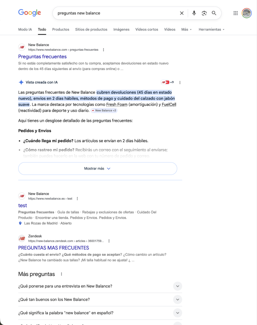 - AI overviews: l’última novetat i, probablement, la que més impacte té en els zero clics. Es tracta de resums generats per Intel·ligència Artificial, utilitzant diferents fonts (incloent-hi els eCommerces). Moltes cerques de tota mena i intenció, es resolen directament al navegador.