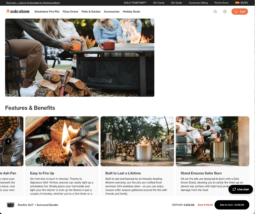 Per posar un exemple que surti dels més recurrents, et deixo el cas de Solo Stove, que fabrica xemeneies i brasers d’exterior (un nínxol força petit). No obstant això, les seves fitxes de producte són tan aspiracionals que les podries consumir gairebé com un article d’un blog i, immediatament, fan que vulguis tenir un d’aquests productes.