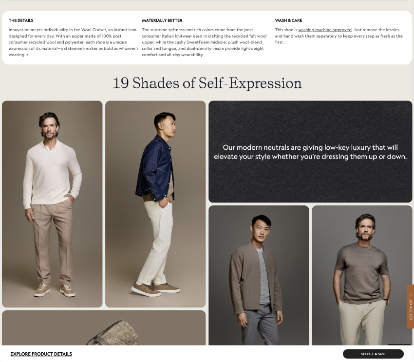 - The detail section is a marvel. It is not limited to three boring paragraphs talking about materials and shoe care. It is capable of including, almost as if it were a blog or a social network, attractive and inspirational content. Here the carefully curated images with product usage context stand out.