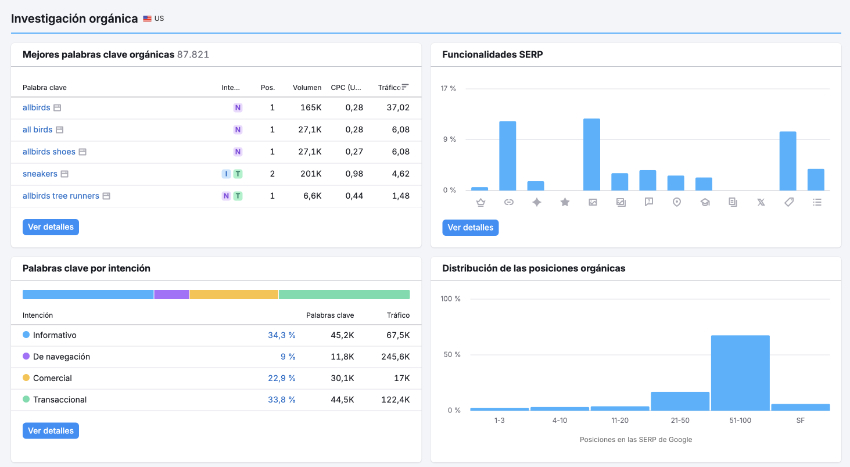 - Allbirds ranks for 145,000 words, of which 7,400 are on the first page, thus generating potentially valuable traffic. In addition, it is very balanced in terms of search intent, distributed almost 33 % between informational, commercial and transactional