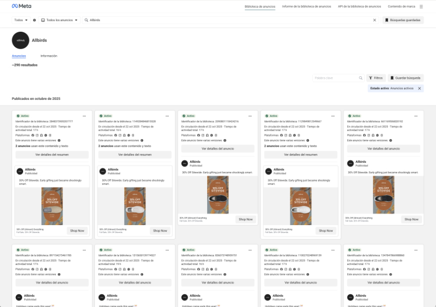 But, of course, paid media is not limited only to Google. We know that platforms like Meta can be especially effective for certain products, such as those of Allbirds.After all, it is a brand that has imprinted in fire its focus on lifestyle and social responsibility, two perfect ingredients to generate attractive content on social networks.Let’s see what they do on Facebook and Instagram platforms. As in the Google case, we can access the transparency repository.