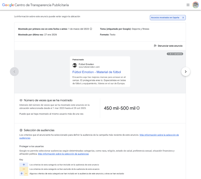 To see what their ads are like, as always, we will turn to official sources. In case you did not know, Google has its transparency center, where you can inspect the ads published by any brand on Google Search, Display and Shopping.For example, we can see this ad from a campaign that seems generic, always running since March 2023.