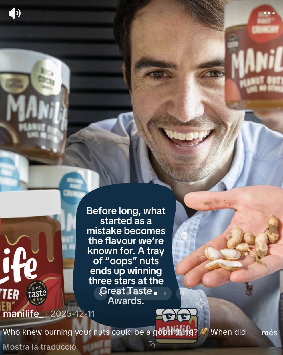 In any case, he was clear that his product was one of the best on the market in terms of quality and, as such, he wanted it to have a premium positioning. In addition, while his competitors used European raw materials with lower production costs, he continued to bet on peanuts from Córdoba and from a specific farm. Competing on price was not an option.And once again, chance crossed paths with the history of this brand. During the roasting process of a batch, someone got distracted. As a result, they ended up with a lot of kilos of “over-roasted” peanuts. But since that was what they had, they decided to continue with the process and see if the result met the minimum standards.The surprise was that they did not obtain an acceptable peanut butter; in fact, they achieved an excellent result, with an intense flavor and a unique texture. This is Manilife’s flagship product right now. Its unique recipe has won countless awards (the most awarded in history, according to themselves).