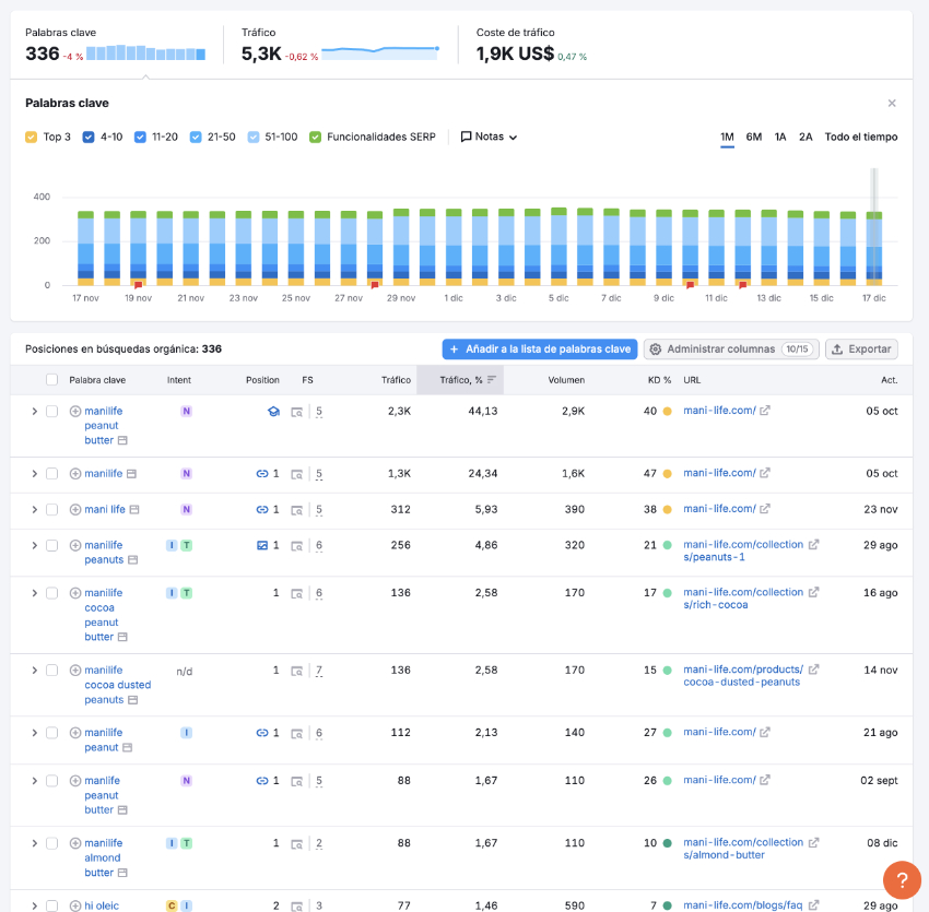 In the case of SEM we will be even quicker, because, at least according to Semrush, they do not run campaigns or there is no record of them.Why? Well, that answer should be given to us by the Manilife team, but we can infer that they simply do not need it.Demand comes directly to the website organically or from any of their other distributors. Surely, having so many sellers and platforms within their commercial mix, it is not in their interest to bid on business keywords in search against them, and brand traffic, where they already rank naturally in top positions, is sufficient.