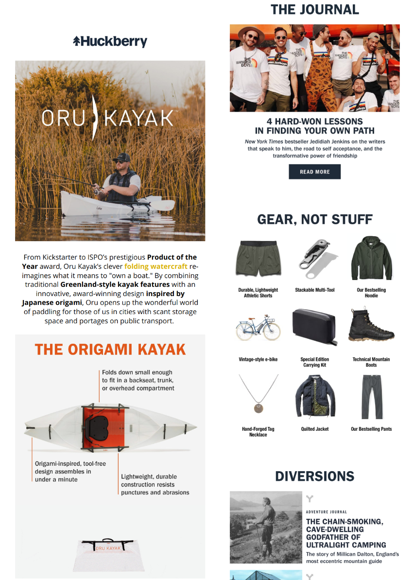 To conclude this overview, and since we have already explored the website and social networks, it is also worth taking a look at another major channel: email marketing.It is interesting to see how new platforms and marketing strategies continue to emerge, but email marketing remains effective, reliable, and inexpensive. Evidently, with these characteristics, it is obvious that it should be included in our list of soft selling solutions.Those customers who have already given us explicit permission to receive communications will greatly appreciate that not all of our relationship is directly transactional.Put another way: promotional emails sell; informational or educational emails build loyalty, reduce the churn rate, and encourage opens or clicks.The example that best fits what I am explaining is Huckberry, an eCommerce specialized in products for men with an adventurous spirit. Take a look at how they work with one of their newsletters.